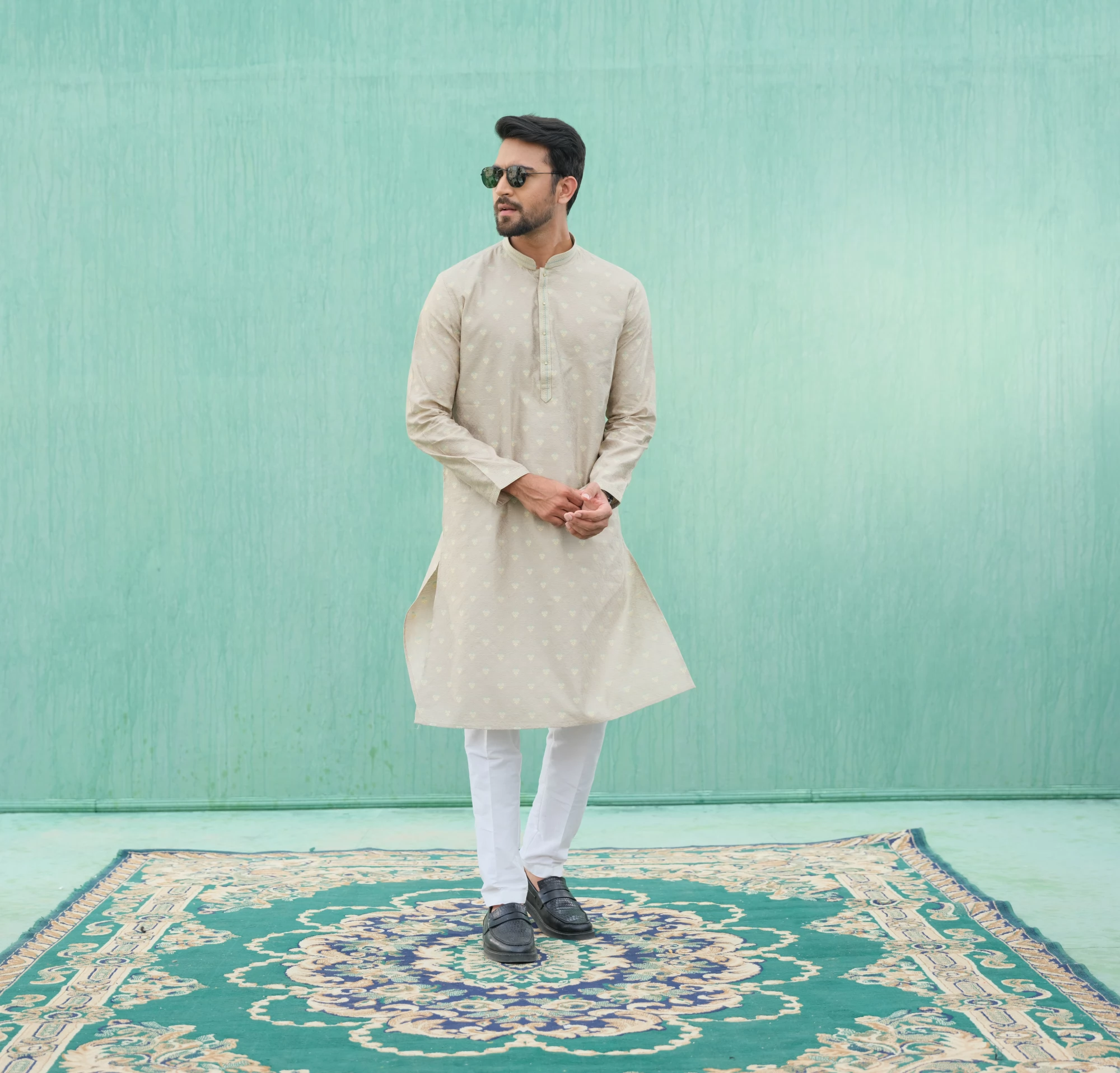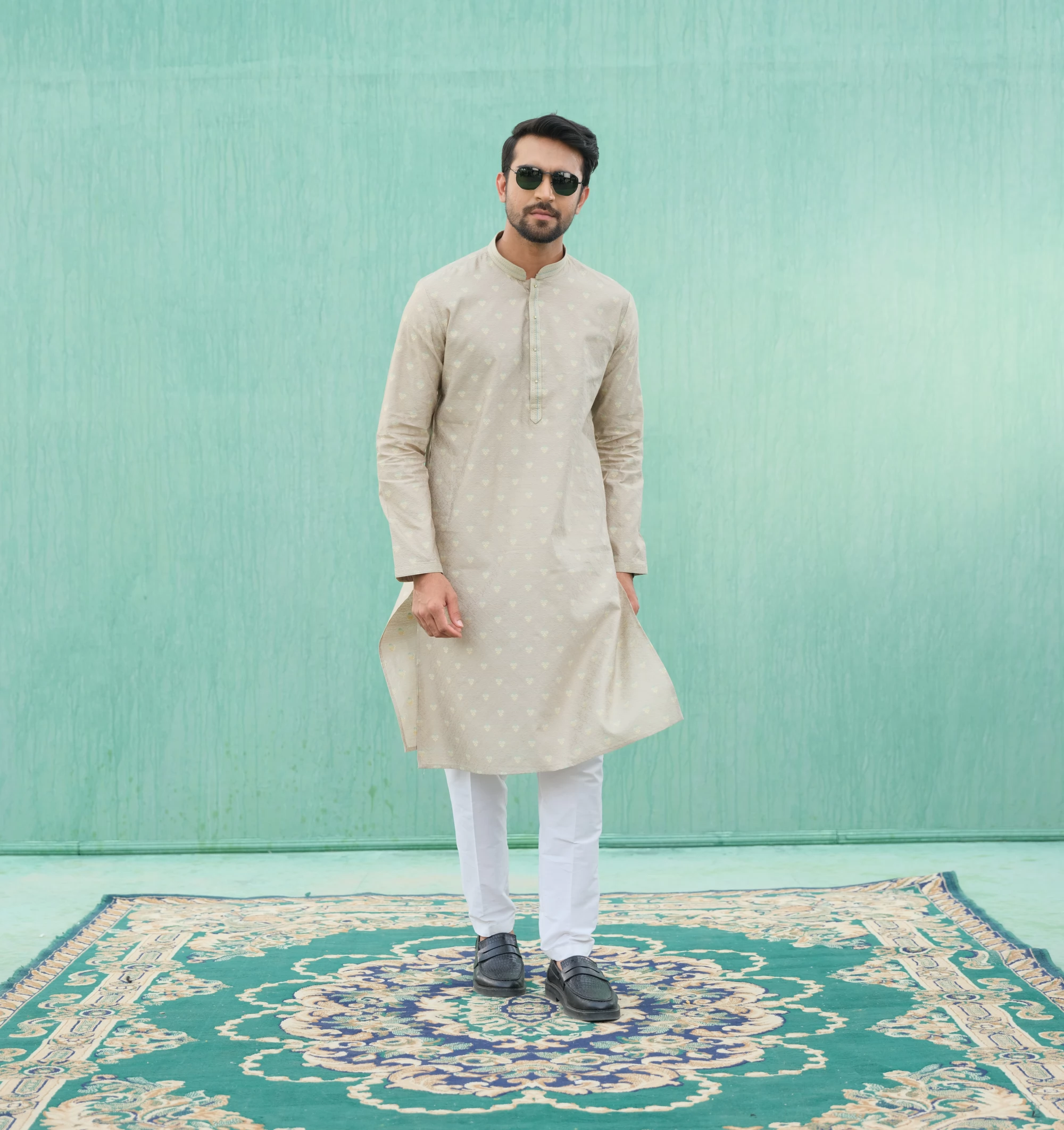 Fabulous gray color party fit cotton panjabi, subtle design button work enhanced and accomplished the look of this panjabi. Your perfect fashion attire.