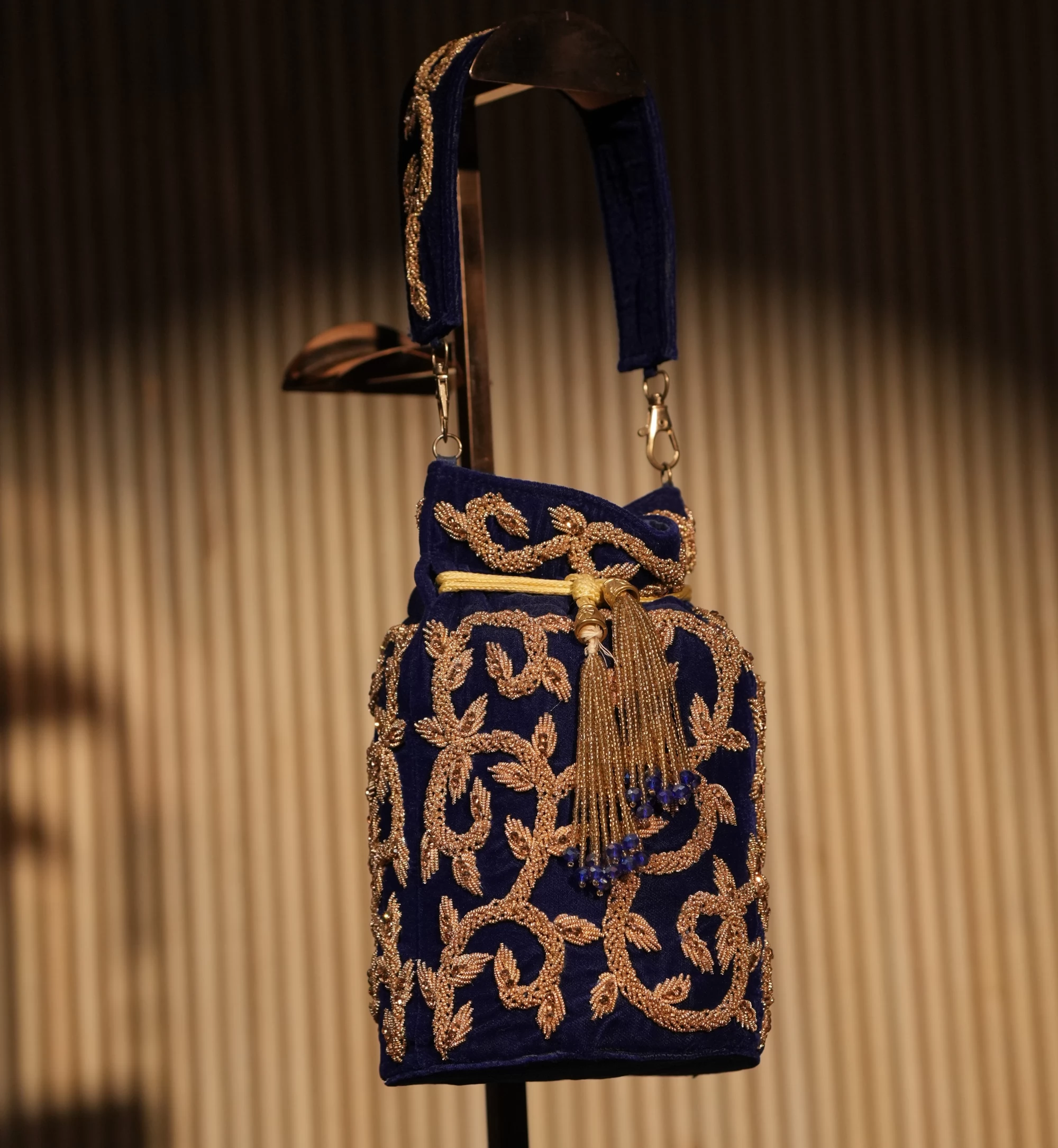 Dazzling zardozi & golden stone work splendid ladies purse, Your accompllishment of fashionable hand carrying purse, styled in vibrant navy blue color.