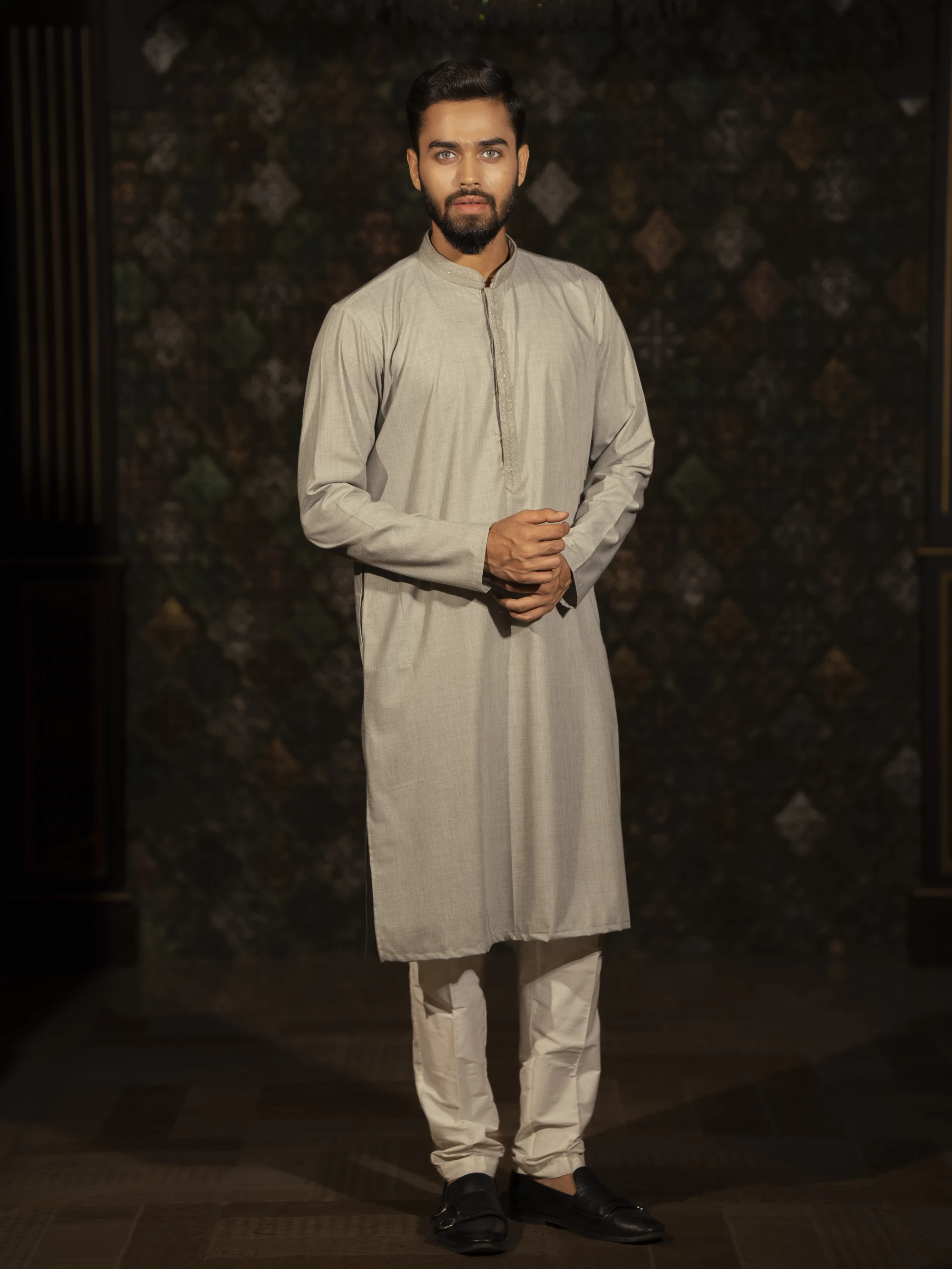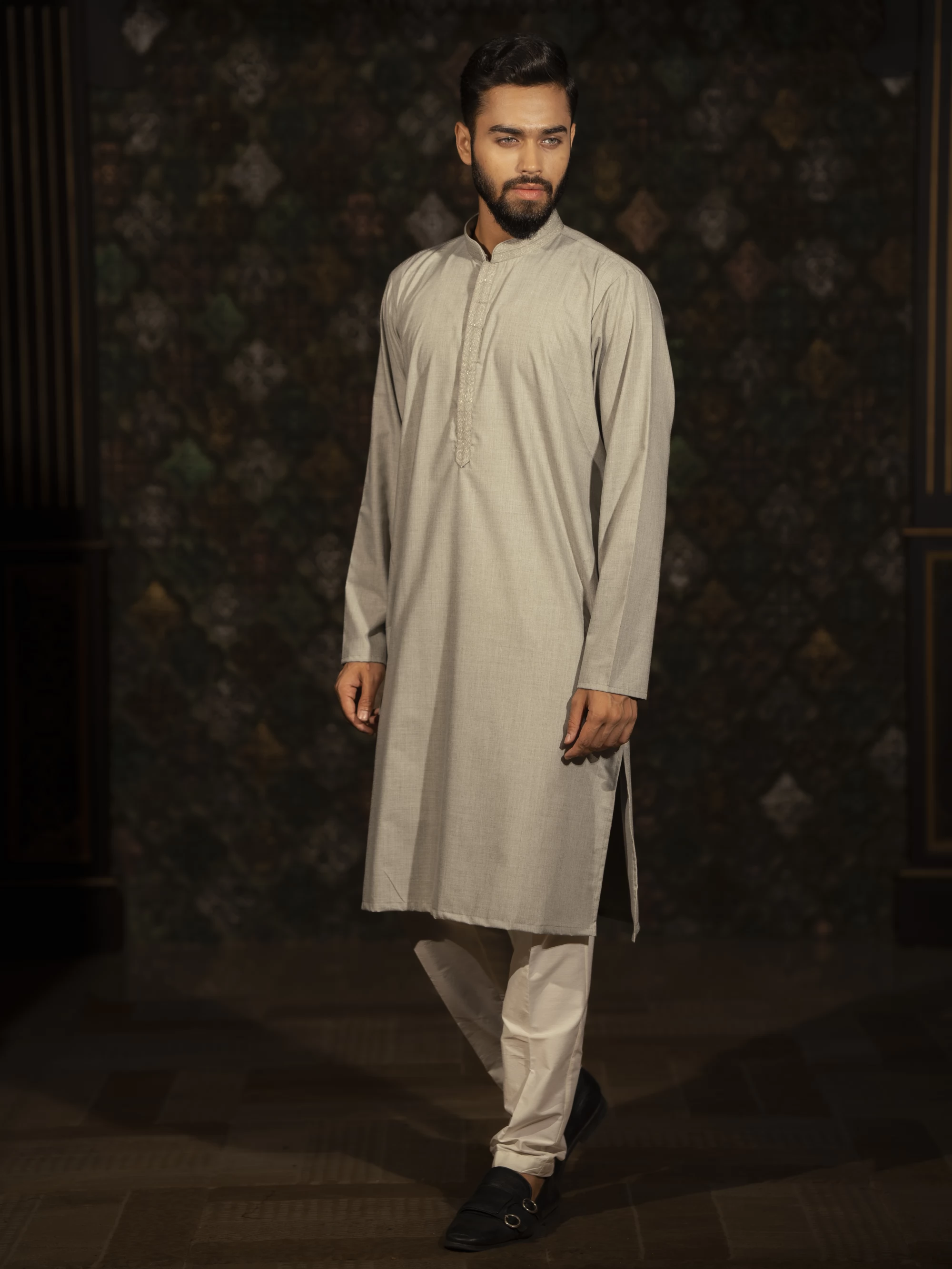 Beautiful gray color casual wear cotton panjabi, perfect looking Eid fashion matching panjabi. The elegant button work enhance your comprehensive look.