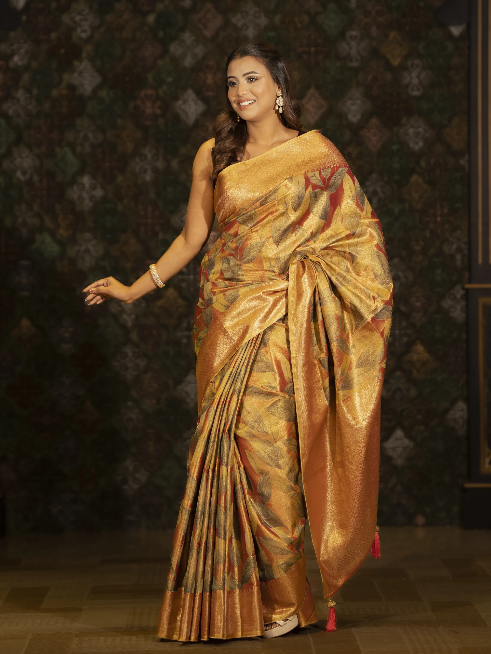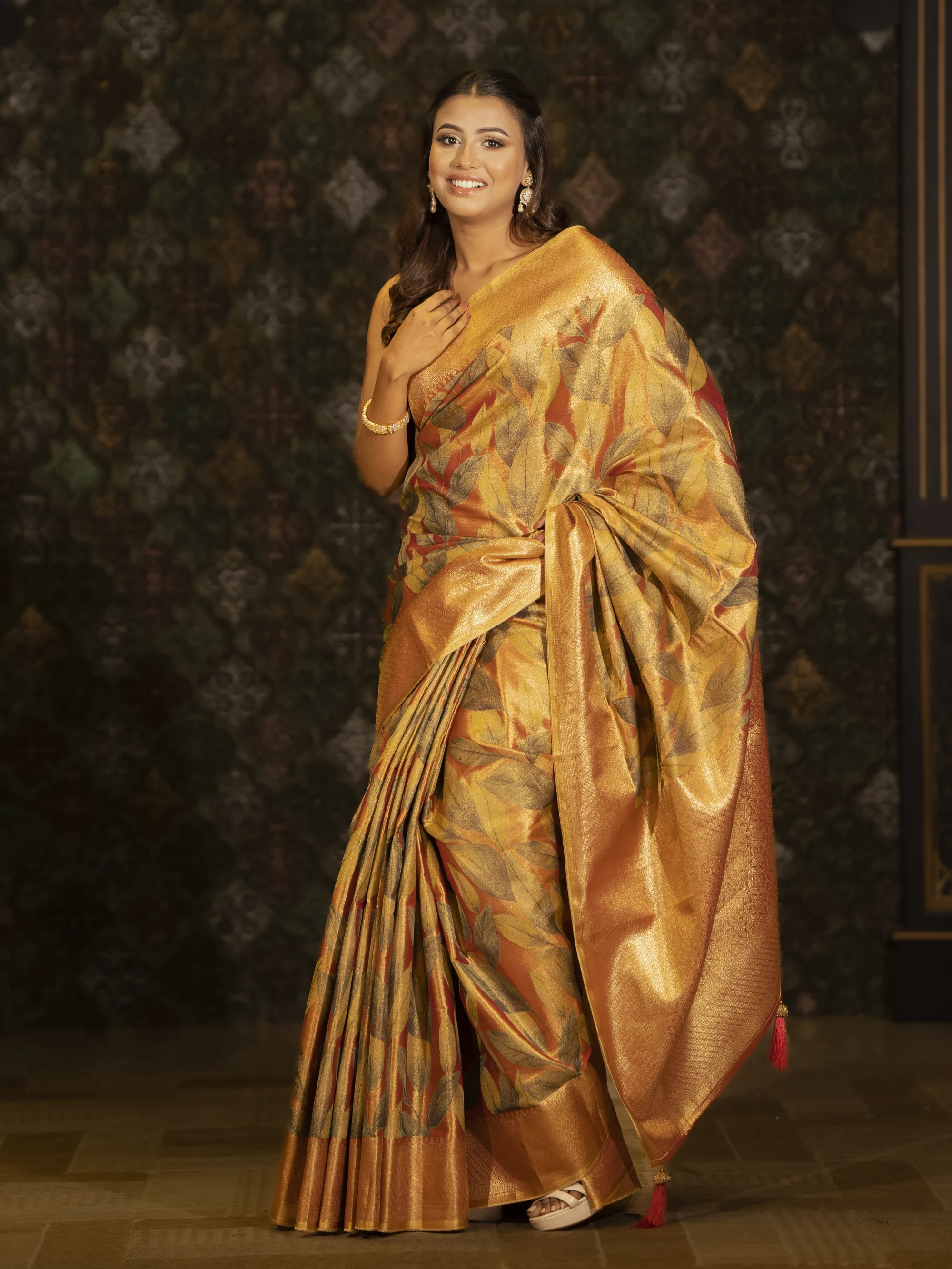 Extraordinary casual wear golden color tissue silk print saree. This saree is very much suitable for bridal reception and as a festive attire. This Unique masterpiece saree will enable you to stand out in the occasion.