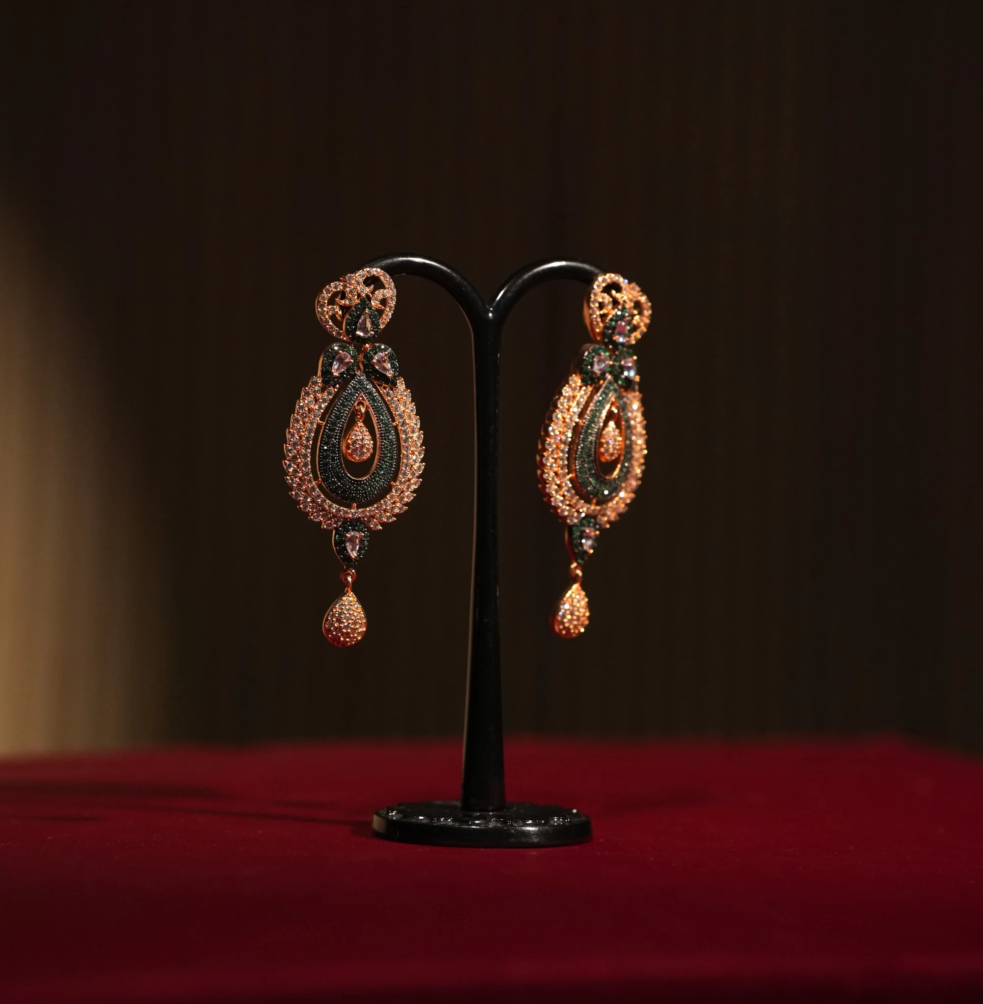 Splendid looking diamond cut stone & green zircon work party wear ear ring. Styled in zircon and crafted with transparent stone work. Truly mesmerizing.
