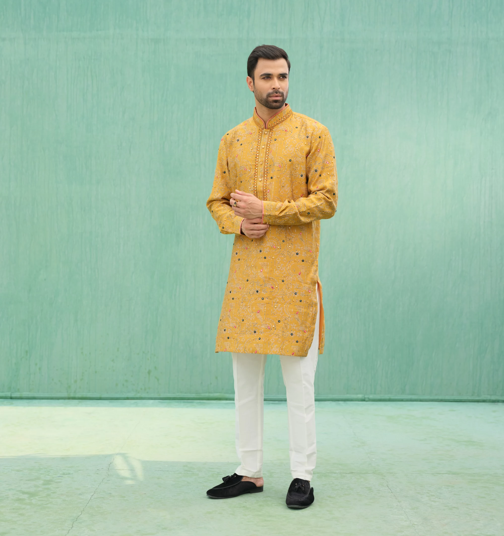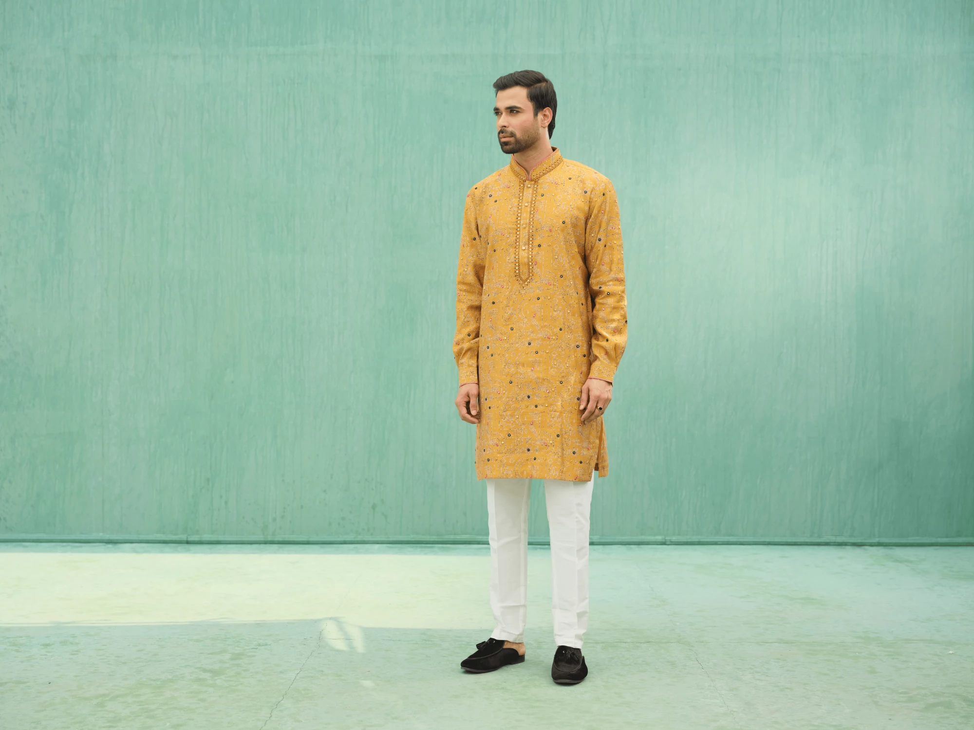 Party wear silk panjabi, designed in mustard yellow silk fabrics. A perfect blend of tradition and trend,