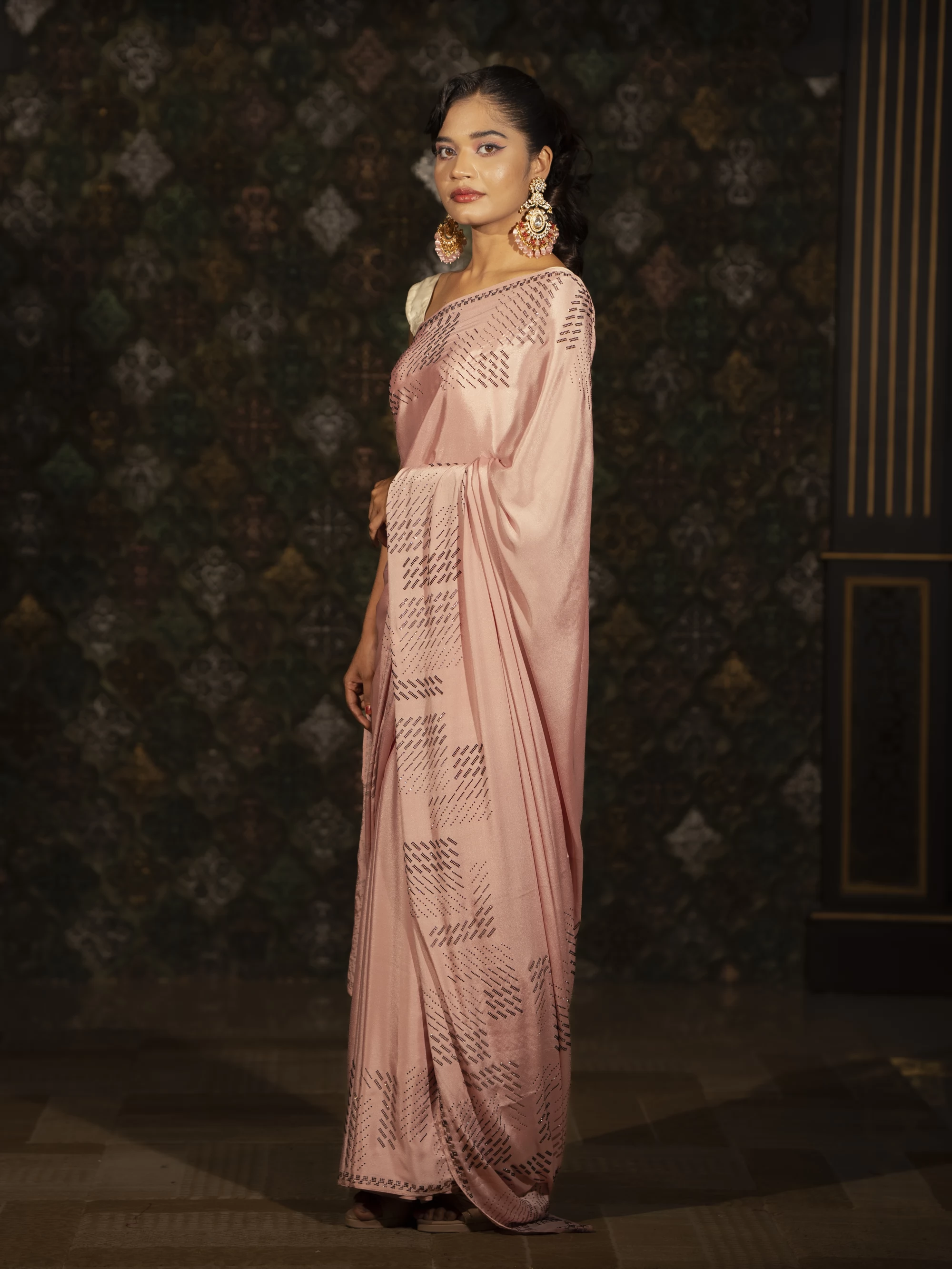 Gorgeous swarovski stone worked pink colored silk saree, your perfect party wear. Stand out from others at Eid festival.Comes with matching unstitched blouse piece attached at the end of saree.
