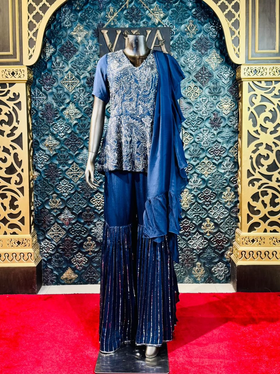 Our Blue & Pink Gharara Suit includes Embroidery is present on this style using zari, sequins, and hand work embellishments.