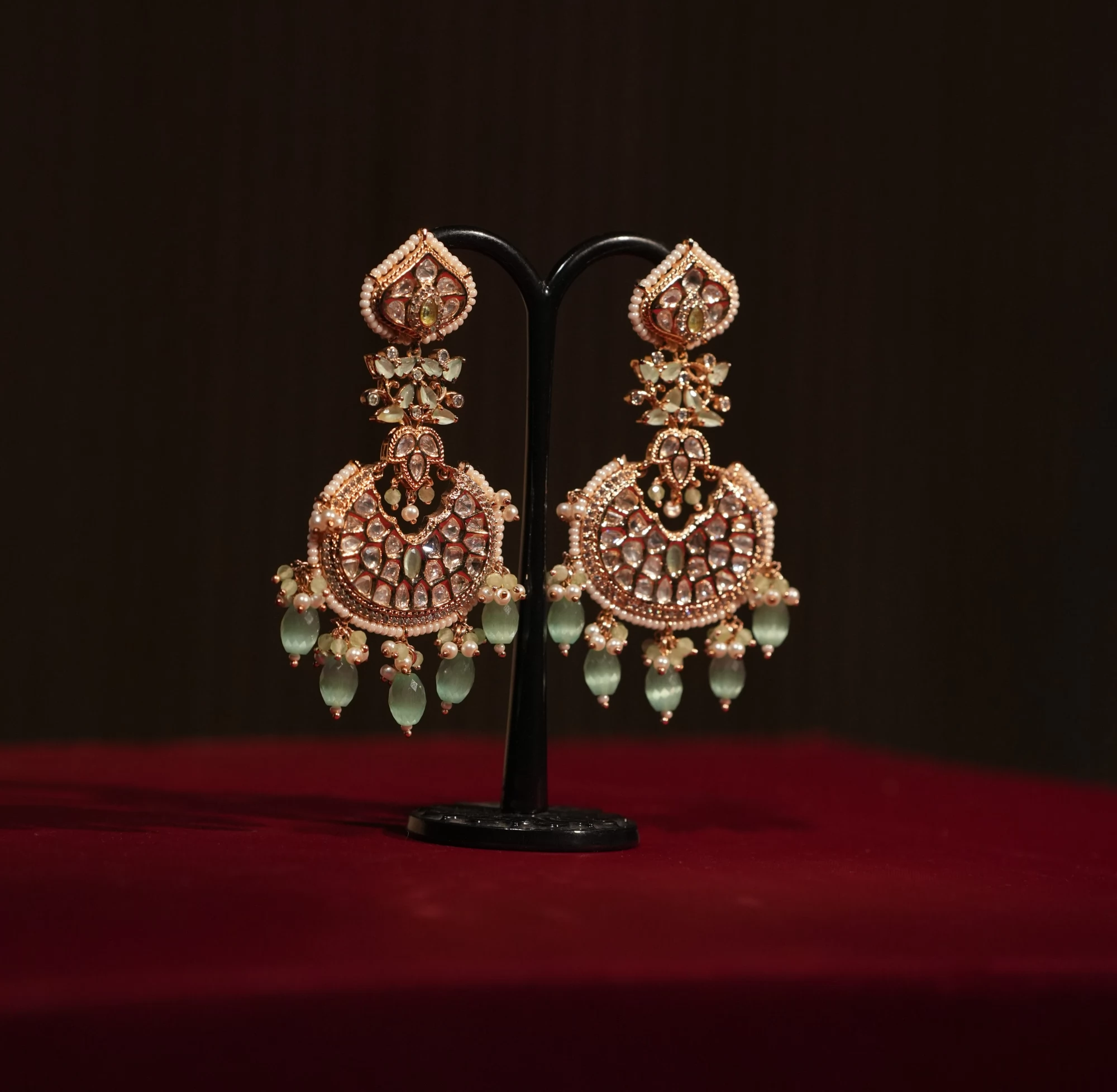Beautiful looking kundan & pearl work party wear ear ring. Styled in zircon and crafted with mint topaz stone work. Truly mesmerizing.