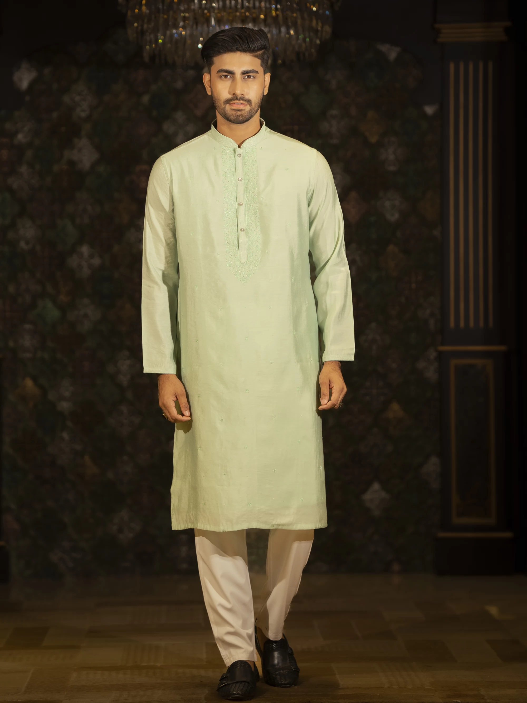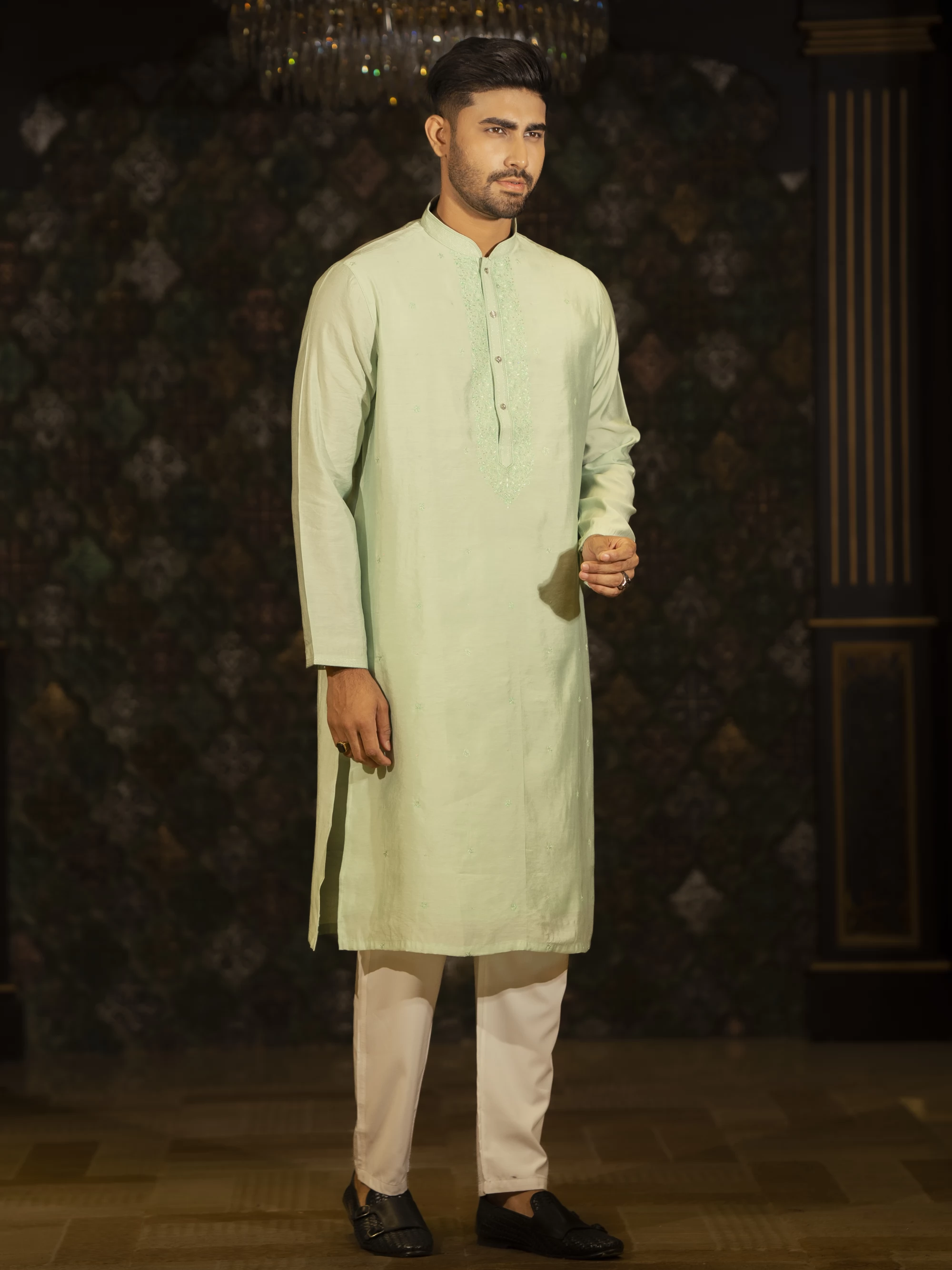 Sea green texture marcelis cotton panjabi with shades of green embroidered. Features in-seam side pockets.