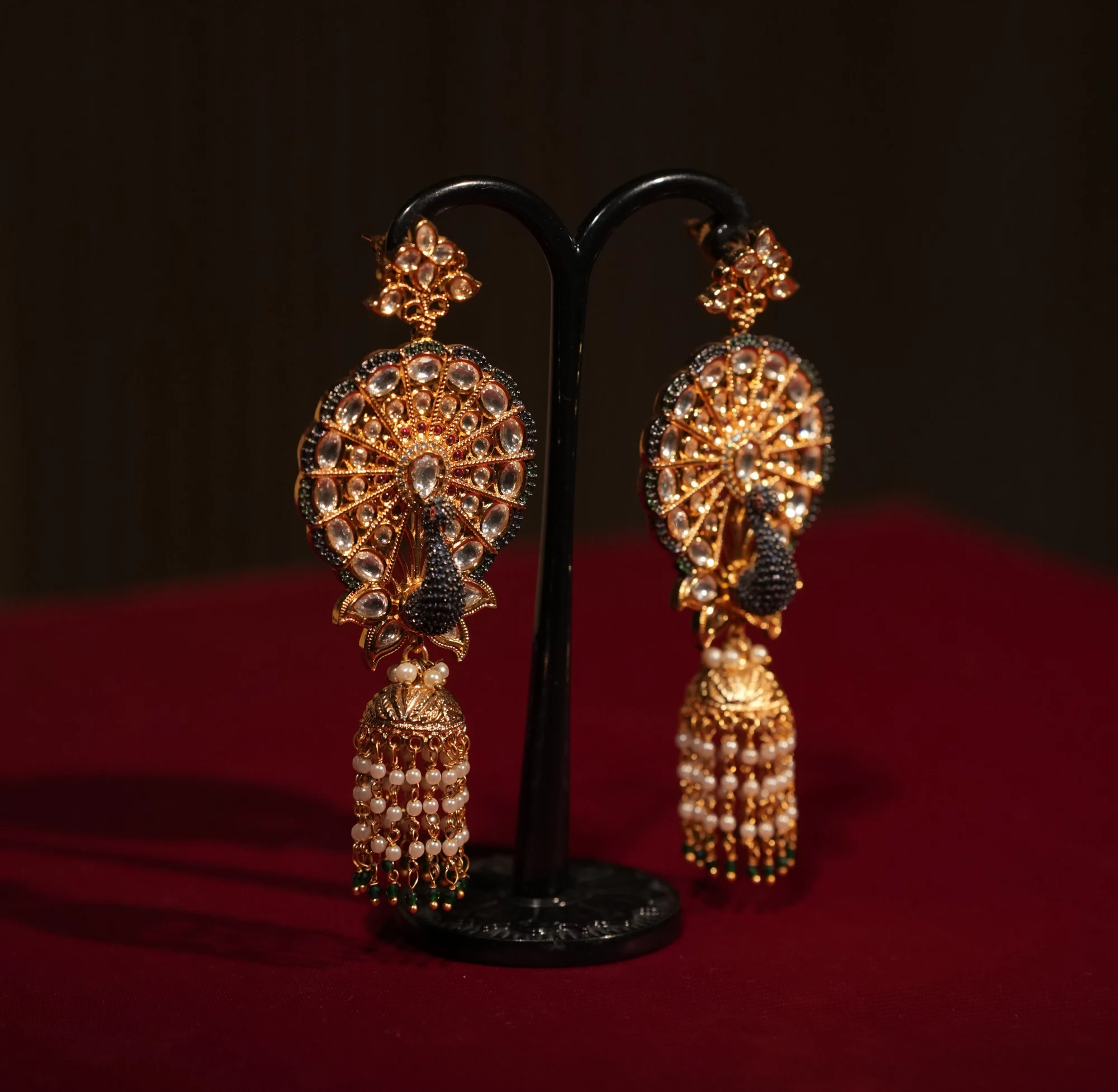 Beautiful looking Golden and blue diamond cut stone, pearl and meena kari work peacock style ear ring. Your perfect match with party wear .