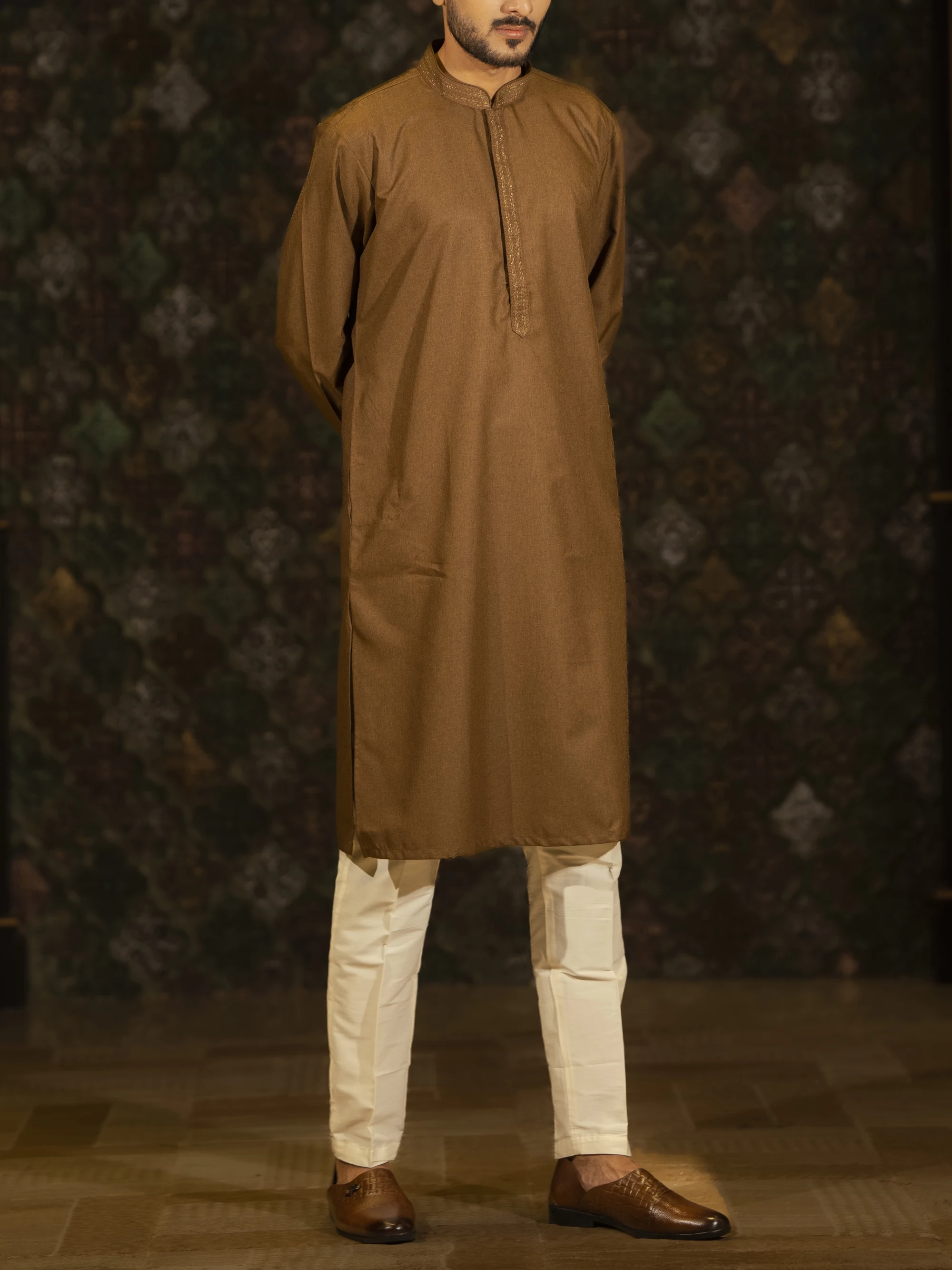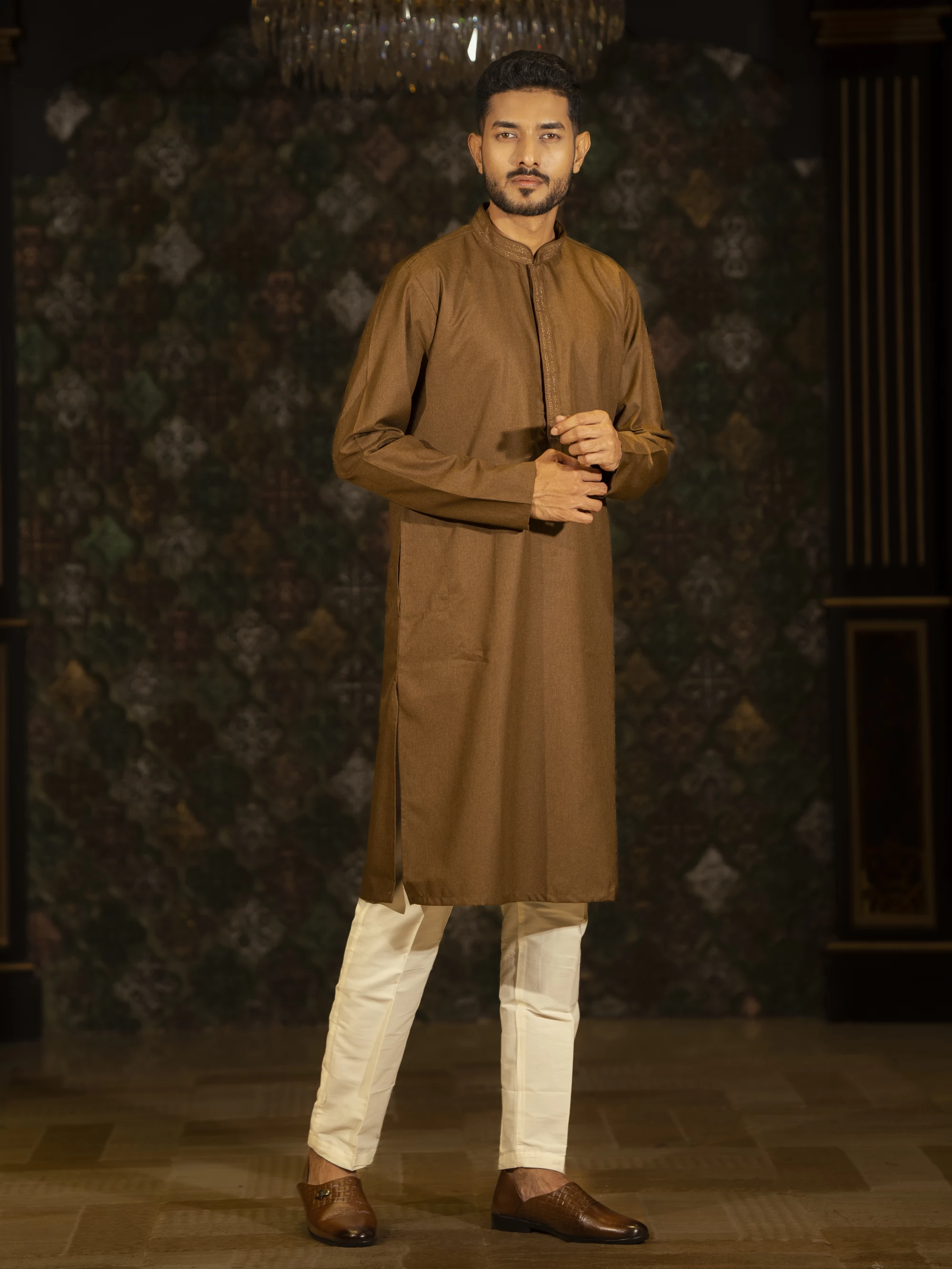 Beautiful brown color regular fit cotton panjabi, subtle button work enhanced and accomplished the look of this panjabi.