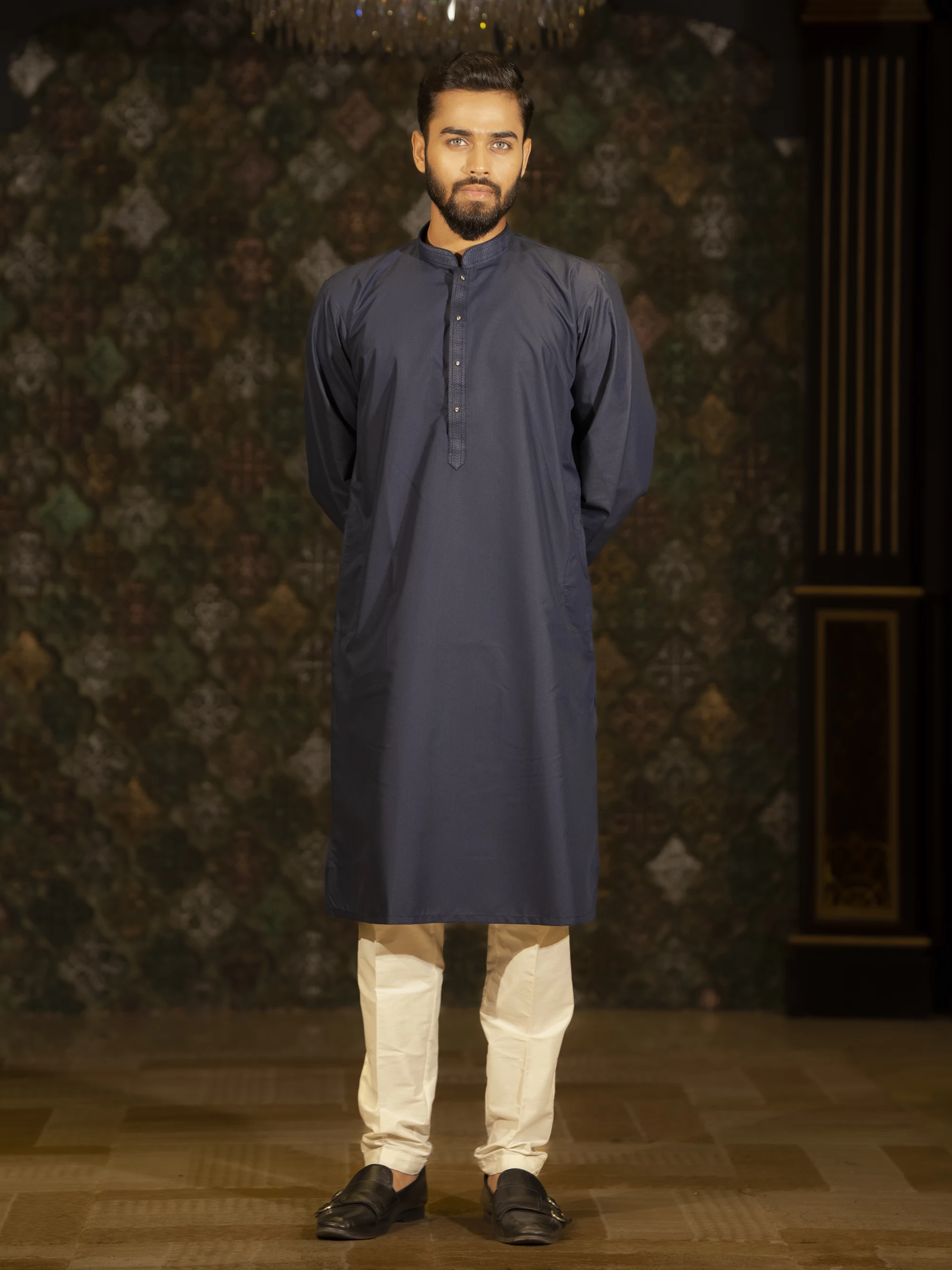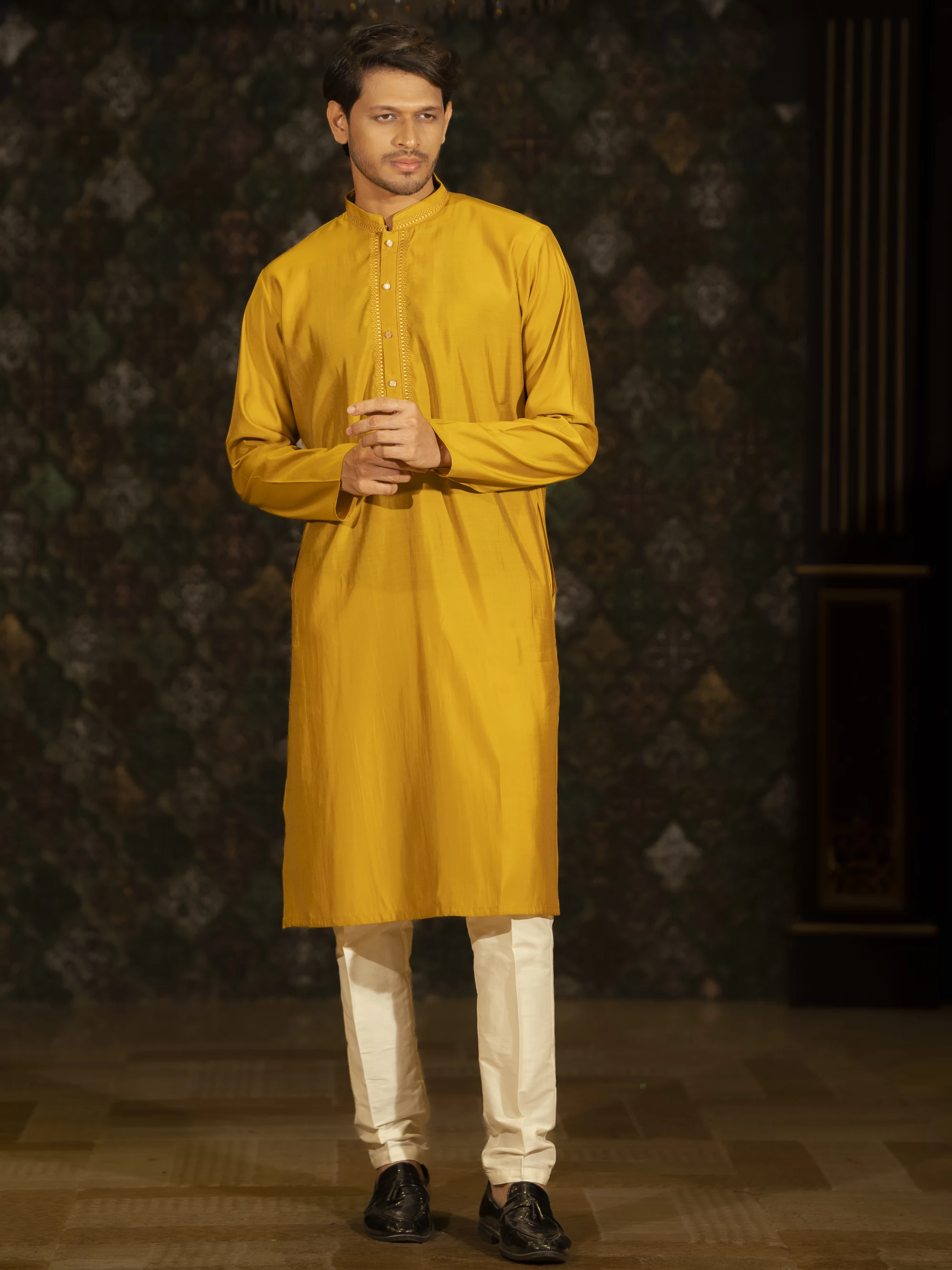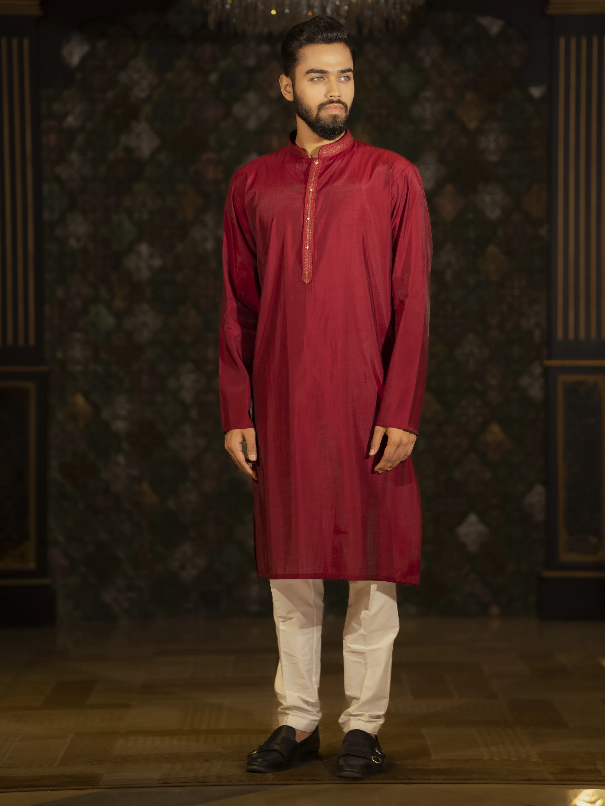 • Silk is perfect for this kind of piece, as it will give off a rich sheen and flow beautifully. The colors would reflect light differently across the silk, making the panjabi feel dynamic.