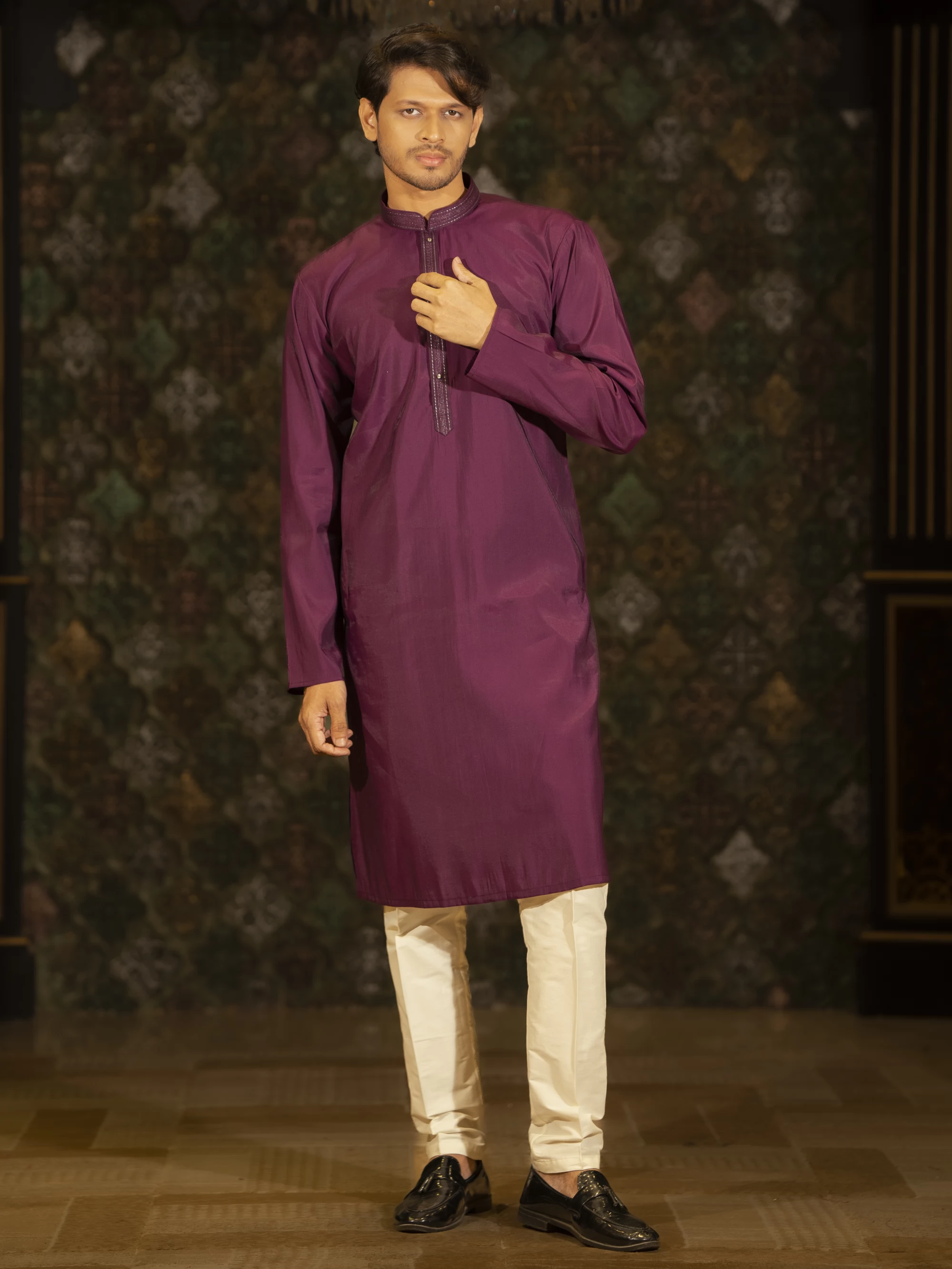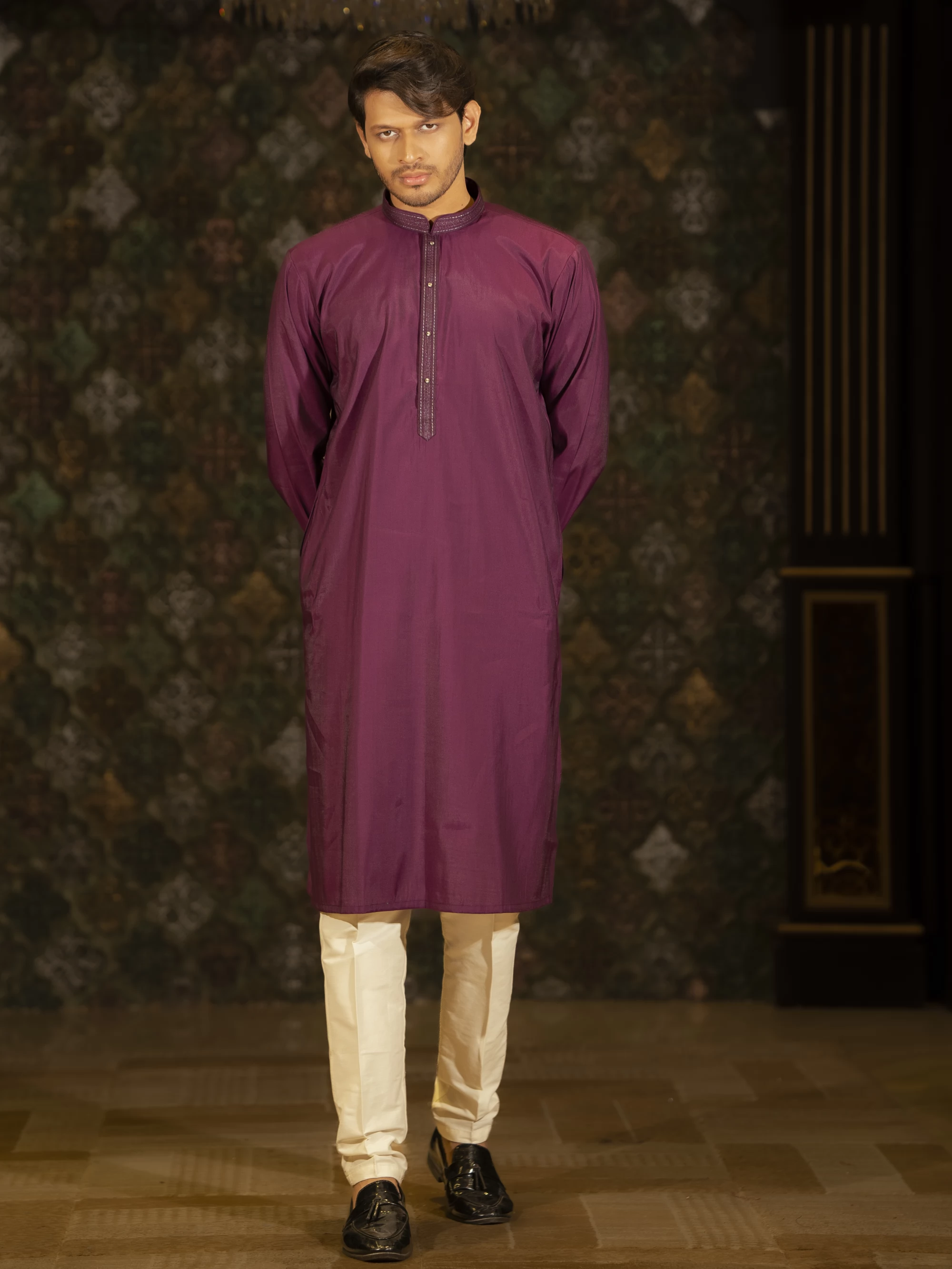 • Purple could accentuate the collar, cuffs, and maybe a strip down the sides of the panjabi for a bold, regal touch.
